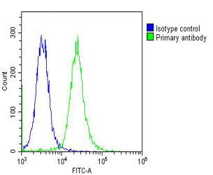 Overlay histogram showing K562 cells stained with APR06167G (green line). The cells were fixed with 2% paraformaldehyde (10 min) and then permeabilized with 90% methanol for 10 min. The cells were then icubated in 2% bovine serum albumin to block non-specific protein-protein interactions followed by the antibody (APR06167G, 1:25 dilution) for 60 min at 37?C. The secondary antibody used was Goat-Anti-Rabbit IgG, DyLight? 488 Conjugated Highly Cross-Adsorbed(OH191631) at 1/200 dilution for 40 min at 37?C. Isotype control antibody (blue line) was rabbit IgG (1μg/1x10^6 cells) used under the same conditions. Acquisition of >10, 000 events was performed.