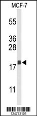 Western blot analysis of AGR3 Antibody (C-term) (Cat. APR06168G) in MCF-7 cell line lysates (35ug/lane). AGR3 (arrow) was detected using the purified Pab.