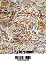 Formalin-fixed and paraffin-embedded human lung carcinoma reacted with AGR3 Antibody (C-term), which was peroxidase-conjugated to the secondary antibody, followed by DAB staining. This data demonstrates the use of this antibody for immunohistochemistry; clinical relevance has not been evaluated.