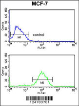 AGR3 Antibody (C-term) (Cat. APR06168G) flow cytometry analysis of MCF-7 cells (bottom histogram) compared to a negative control cell (top histogram).FITC-conjugated goat-anti-rabbit secondary antibodies were used for the analysis. |