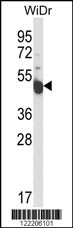 Western blot analysis of INSC Antibody (Center) (Cat. APR06185G) in WiDr cell line lysates (35ug/lane). INSC (arrow) was detected using the purified Pab.