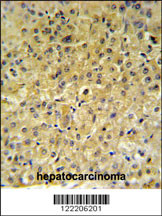 INSC Antibody (Center) (Cat. APR06185G) IHC analysis in formalin fixed and paraffin embedded hepatocarcinoma followed by peroxidase conjugation of the secondary antibody and DAB staining. This data demonstrates the use of the INSC Antibody (Center) for immunohistochemistry. Clinical relevance has not been evaluated. |