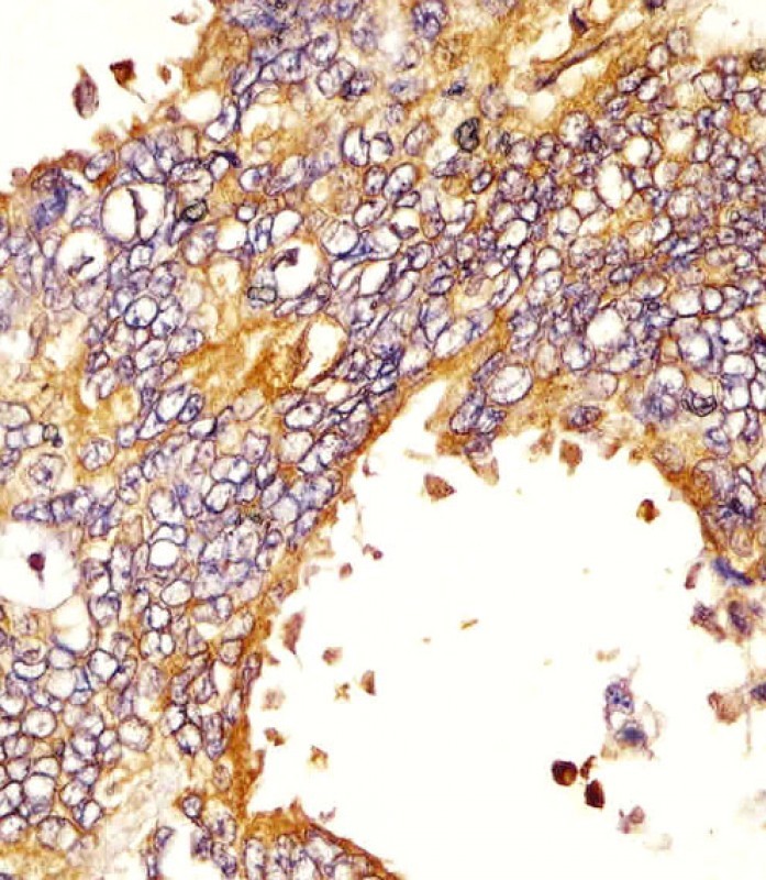 AMM02493G staining EGFR in human lung adenocarcinoma sections by Immunohistochemistry (IHC-P - paraformaldehyde-fixed, paraffin-embedded sections). Tissue was fixed with formaldehyde and blocked with 3% BSA for 0. 5 hour at room temperature; antigen retrieval was by heat mediation with a citrate buffer (pH6). Samples were incubated with primary antibody (1/25) for 1 hours at 37°C. A undiluted biotinylated goat polyvalent antibody was used as the secondary antibody.