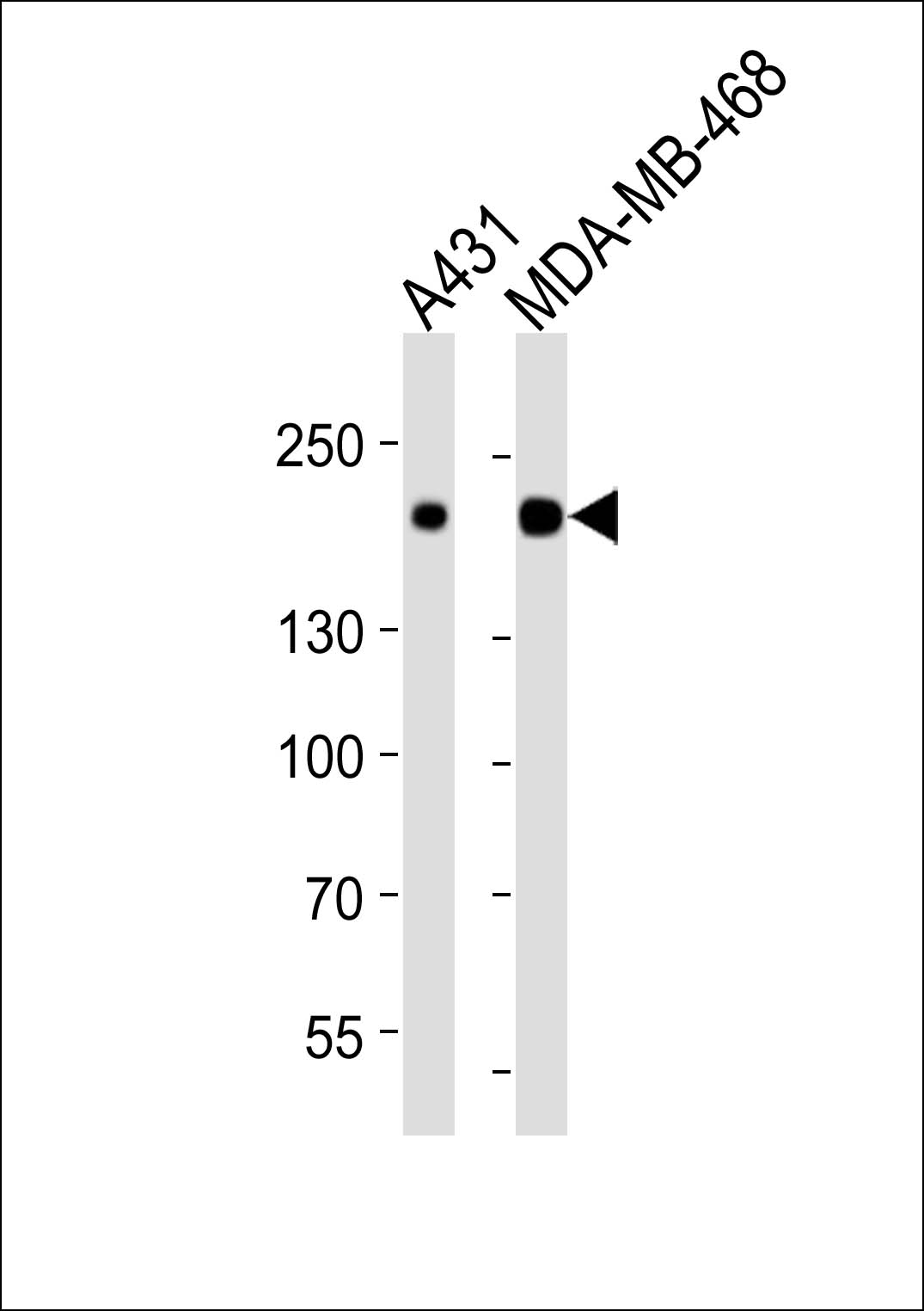 Western blot analysis of lysates from A431, MDA-MB-468 cell line (from left to right), using EGFR Antibody(AMM02493G). AMM02493G was diluted at 1:1000 at each lane. A goat anti-mouse IgG H&L(HRP) at 1:10000 dilution was used as the secondary antibody. Lysates at 20μg per lane. |