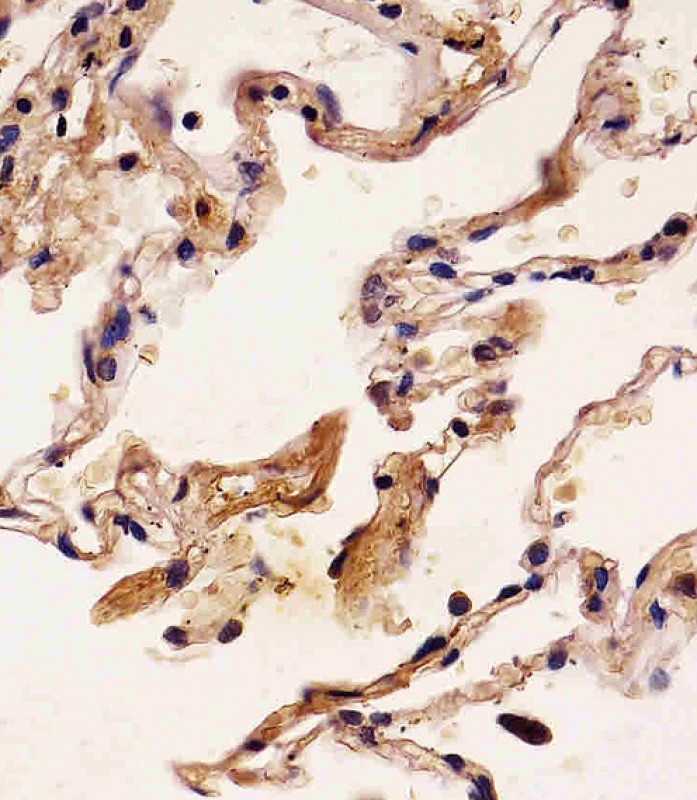 AMM02537G staining S100A2 in human lung tissue sections by Immunohistochemistry (IHC-P - paraformaldehyde-fixed, paraffin-embedded sections). Tissue was fixed with formaldehyde and blocked with 3% BSA for 0. 5 hour at room temperature; antigen retrieval was by heat mediation with a citrate buffer (pH6). Samples were incubated with primary antibody (1/25) for 1 hours at 37°C. A undiluted biotinylated goat polyvalent antibody was used as the secondary antibody.