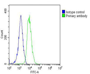 Overlay histogram showing U-2OS cells stained with AMM02555G(green line). The cells were fixed with 2% paraformaldehyde (10 min) and then permeabilized with 90% methanol for 10 min. The cells were then icubated in 2% bovine serum albumin to block non-specific protein-protein interactions followed by the antibody (AMM02555G, 1:25 dilution) for 60 min at 37?C. The secondary antibody used was Goat-Anti-Mouse IgG, DyLight? 488 Conjugated Highly Cross-Adsorbed(OJ192088) at 1/200 dilution for 40 min at 37?C. Isotype control antibody (blue line) was mouse IgG2a (1μg/1x10^6 cells) used under the same conditions. Acquisition of >10, 000 events was performed.