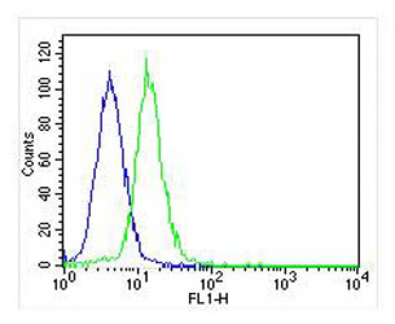 Overlay histogram showing Hela cells stained with APR03565G (green line). The cells were fixed with 2% paraformaldehyde (10 min) and then permeabilized with 90% methanol for 10 min. The cells were then icubated in 2% bovine serum albumin to block non-specific protein-protein interactions followed by the antibody (APR03565G, 1:25 dilution) for 60 min at 37?C. The secondary antibody used was Goat-Anti-Rabbit IgG, DyLight? 488 Conjugated Highly Cross-Adsorbed(OH191631) at 1/400 dilution for 40 min at 37?C. Isotype control antibody (blue line) was rabbit IgG (1μg/1x10^6 cells) used under the same conditions. Acquisition of >10, 000 events was performed.