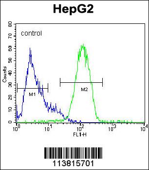NANOG Antibody (N-term) (Cat. APR04033G) flow cytometric analysis of HepG2 cells (right histogram) compared to a negative control (left histogram).FITC-conjugated goat-anti-rabbit secondary antibodies were used for the analysis.