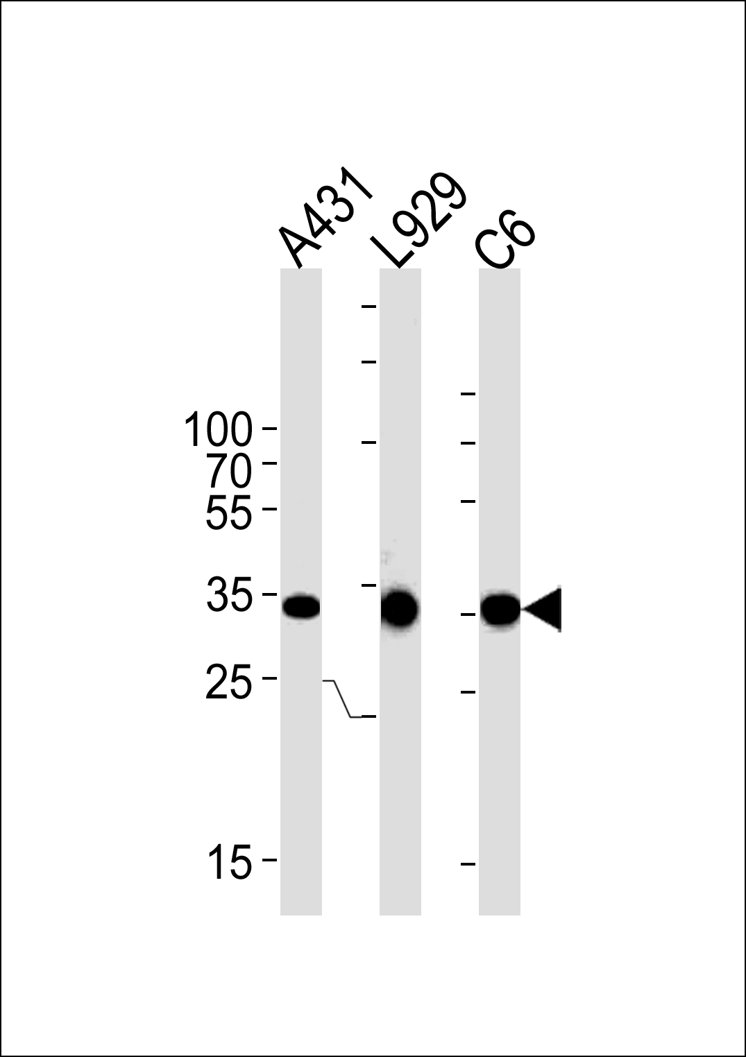 CCND1 Antibody (T286) (Cat. APR04560G) western blot analysis in A431,mouse L929,rat C6 cell line lysates (35ug/lane).This demonstrates the CCND1 antibody detected the CCND1 protein (arrow). |