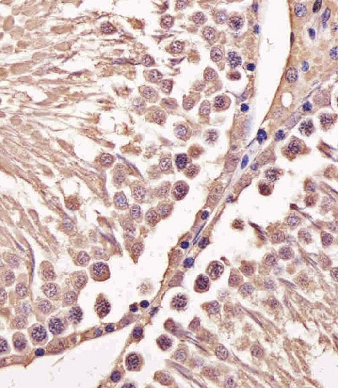 Immunohistochemical analysis of paraffin-embedded M. testis section using M CCNB1 Antibody (Center S123/S125)( APR04562G). APR04562G was diluted at 1:25 dilution. A undiluted biotinylated goat polyvalent antibody was used as the secondary, followed by DAB staining.