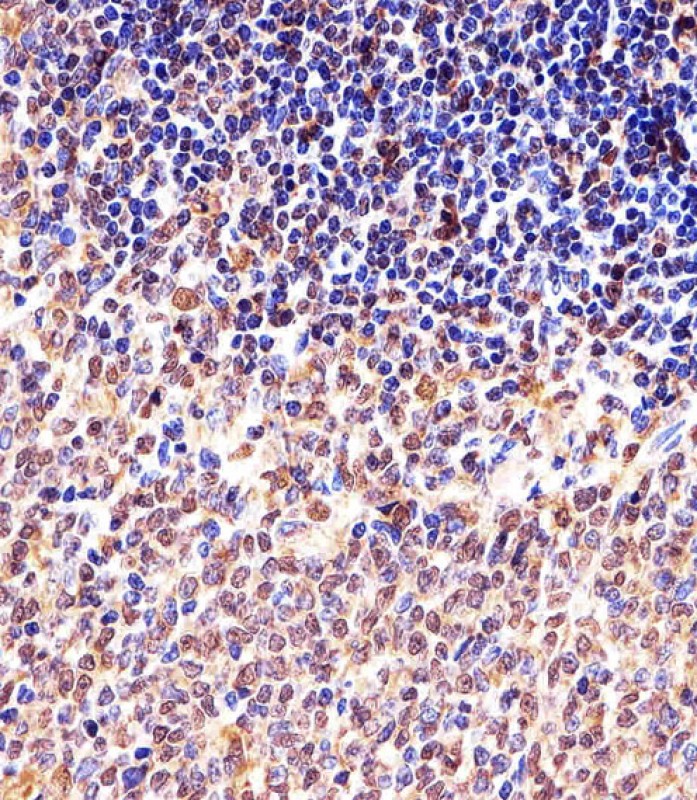 Immunohistochemical analysis of paraffin-embedded M. spleen section using M CCNB1 Antibody (Center S123/S125)( APR04562G). APR04562G was diluted at 1:25 dilution. A undiluted biotinylated goat polyvalent antibody was used as the secondary, followed by DAB staining.