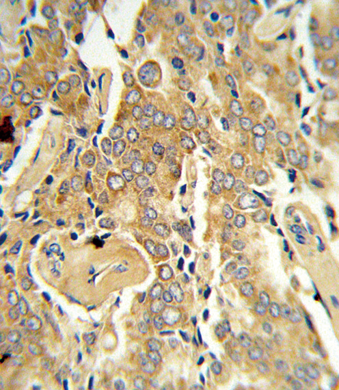 Formalin-fixed and paraffin-embedded human prostate carcinoma reacted with VEGFC Antibody, which was peroxidase-conjugated to the secondary antibody, followed by DAB staining. This data demonstrates the use of this antibody for immunohistochemistry; clinical relevance has not been evaluated. |