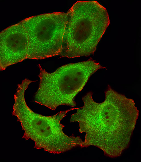 Fluorescent image of MCF-7 cells stained with SMAD1 Antibody (Center)( APR04642G). APR04642G was diluted at 1:25 dilution. An Alexa Fluor 488-conjugated goat anti-rabbit lgG at 1:400 dilution was used as the secondary antibody (green). Cytoplasmic actin was counterstained with Alexa Fluor? 555 conjugated with Phalloidin (red).