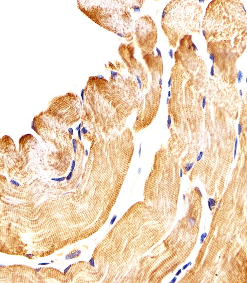 Immunohistochemical analysis of paraffin-embedded H. skeletal muscle section using SMAD1 Antibody (Center)( APR04642G). APR04642G was diluted at 1:25 dilution. A peroxidase-conjugated goat anti-rabbit IgG at 1:400 dilution was used as the secondary antibody, followed by DAB staining. |