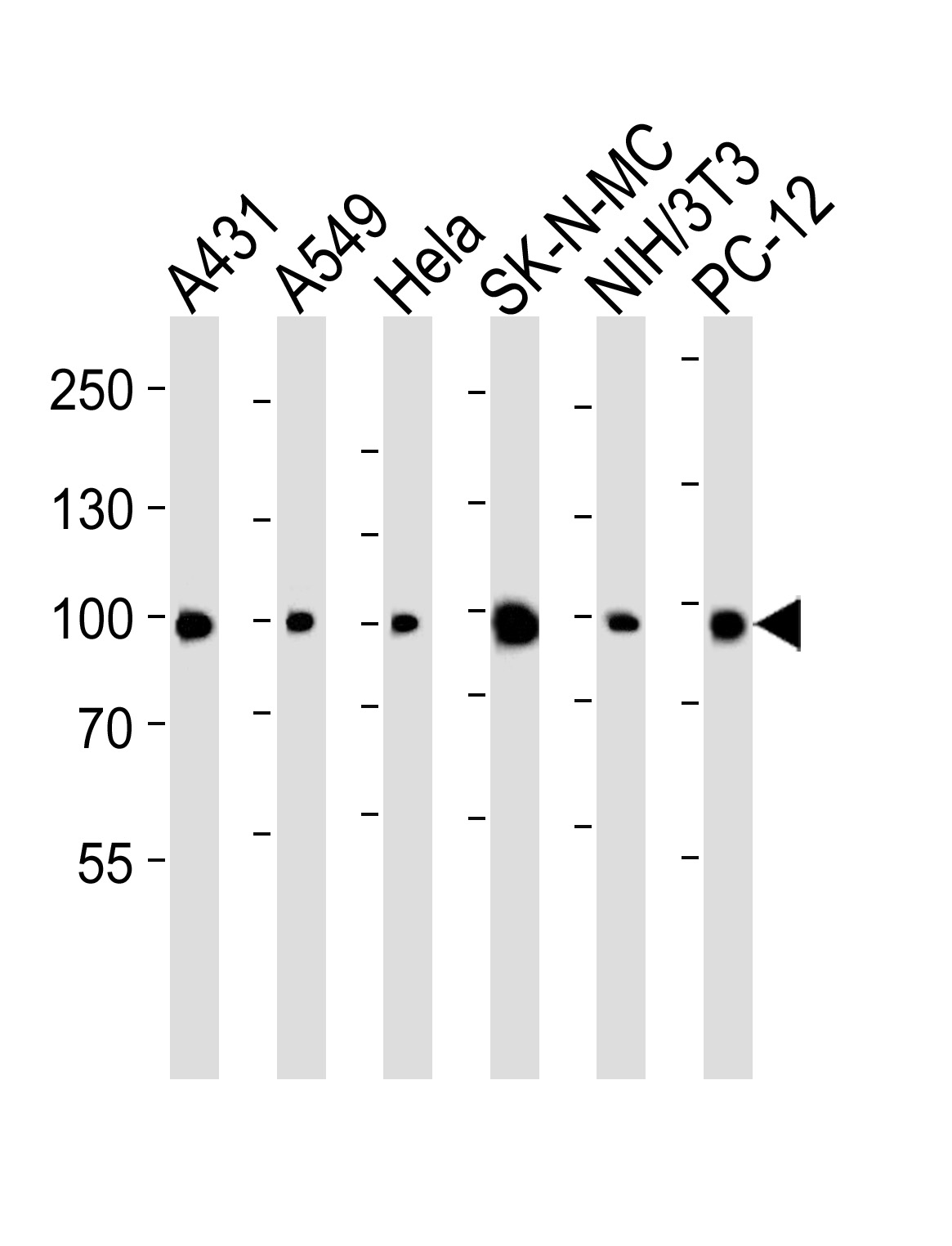 Western blot analysis of lysates from A431, A549, Hela, SK-N-MC, mouse NIH/3T3, rat PC-12 cell line (from left to right), using HSP90 Antibody (N-term)(APR04648G). APR04648G was diluted at 1:1000 at each lane. A goat anti-rabbit IgG H&L(HRP) at 1:5000 dilution was used as the secondary antibody. Lysates at 35ug per lane. |