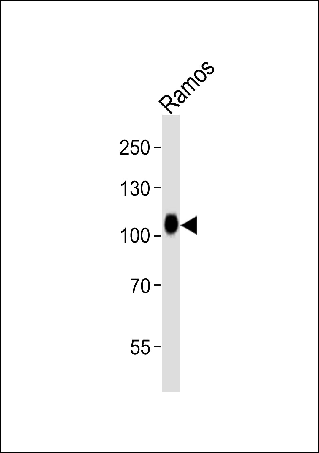 Western blot analysis of lysate from Ramos cell line, using CD19 Antibody (C-term)(APR04699G). APR04699G was diluted at 1:1000. A goat anti-rabbit IgG H&L(HRP) at 1:10000 dilution was used as the secondary antibody. Lysate at 35ug. |
