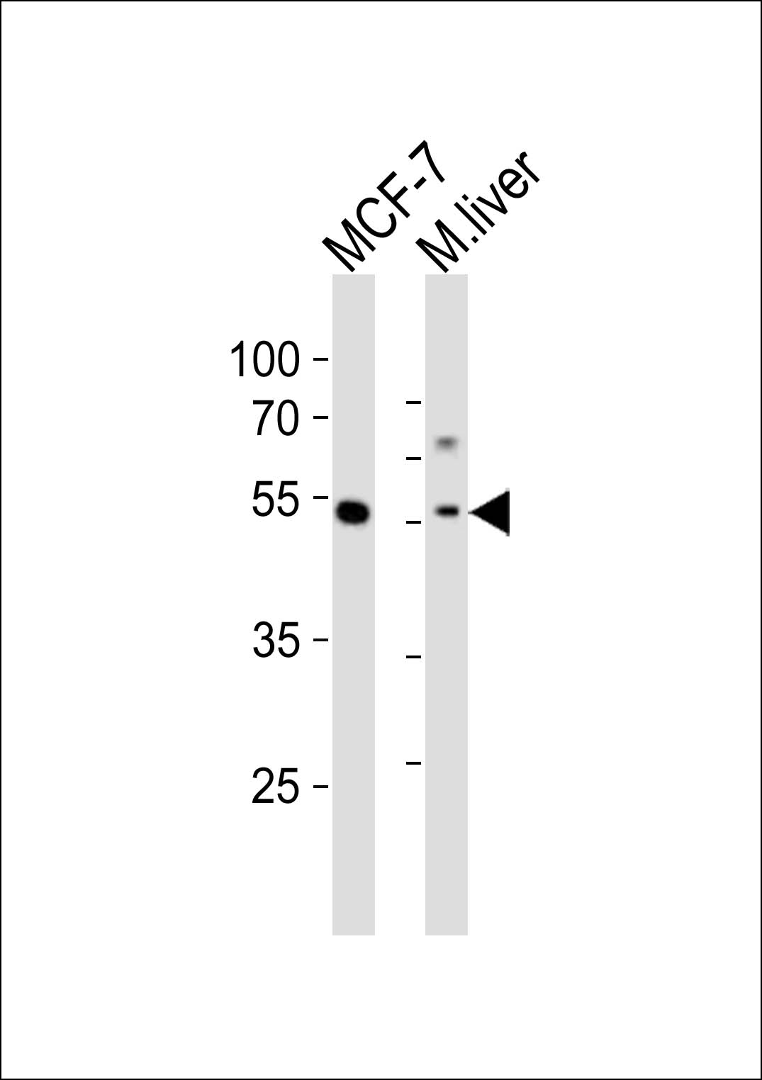 Western blot analysis of lysates from MCF-7 cell line, mouse liver tissue lysate (from left to right), using Gata6 Antibody (C-term)(APR04707G). APR04707G was diluted at 1:1000 at each lane. A goat anti-rabbit IgG H&L(HRP) at 1:10000 dilution was used as the secondary antibody. Lysates at 20ug per lane. |