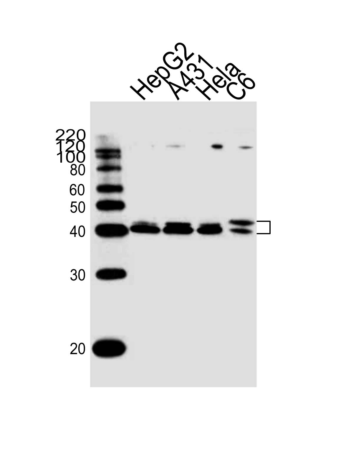 Western blot analysis of lysates from HepG2, A431, Hela, rat C6 cell line (from left to right), using MAPK3/1 Antibody (Center)(APR04754G). APR04754G was diluted at 1:1000 at each lane. A goat anti-rabbit IgG H&L(HRP) at 1:10000 dilution was used as the secondary antibody.