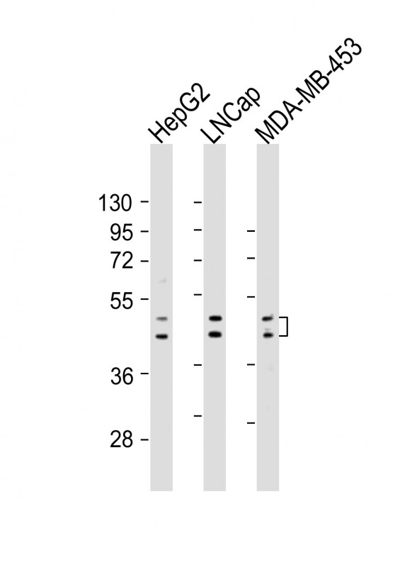All lanes : Anti-UGT2B4 Antibody (Center) at 1:2000 dilution Lane 1: HepG2 whole cell lysates Lane 2: LNCap whole cell lysates Lane 3: MDA-MB-453 whole cell lysates Lysates/proteins at 20 μg per lane. Secondary Goat Anti-Rabbit IgG, (H+L), Peroxidase conjugated at 1/10000 dilution. Predicted band size : 61 kDa Blocking/Dilution buffer: 5% NFDM/TBST.
