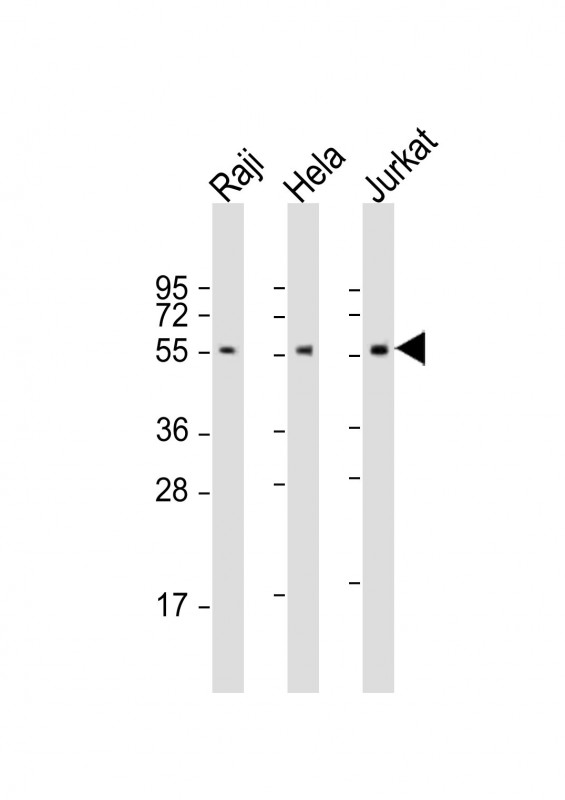 All lanes : Anti-IRF3 Antibody (N-Term) at 1:2000 dilution Lane 1: Raji whole cell lysate Lane 2: Hela whole cell lysate Lane 3: Jurkat whole cell lysate Lysates/proteins at 20 μg per lane. Secondary Goat Anti-Rabbit IgG, (H+L), Peroxidase conjugated at 1/10000 dilution. Predicted band size : 47 kDa Blocking/Dilution buffer: 5% NFDM/TBST. |