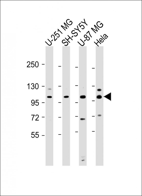 All lanes : Anti-SH3PXD2B Antibody (Center) at 1:2000 dilution Lane 1: U-251 MG whole cell lysate Lane 2: SH-SY5Y whole cell lysate Lane 3: U-87 MG whole cell lysate Lane 4: Hela whole cell lysate Lysates/proteins at 20 μg per lane. Secondary Goat Anti-Rabbit IgG, (H+L), Peroxidase conjugated at 1/10000 dilution. Predicted band size : 102 kDa Blocking/Dilution buffer: 5% NFDM/TBST. |