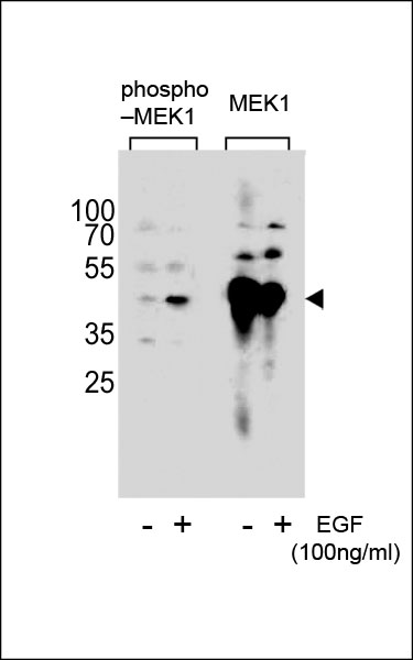 Western blot analysis of extracts from A431 cell,untreated or treated with EGF,100ng/ml,using Phospho-MEK1-pS222(left) or MEK1-pS222 antibody(right).