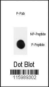 Dot blot analysis of anti-Phospho-MEK1-pS222 Antibody (Cat.APR05214G) on nitrocellulose membrane. 50ng of Phospho-peptide or Non Phospho-peptide per dot were adsorbed. Antibody working concentrations are 0.5ug per ml. |