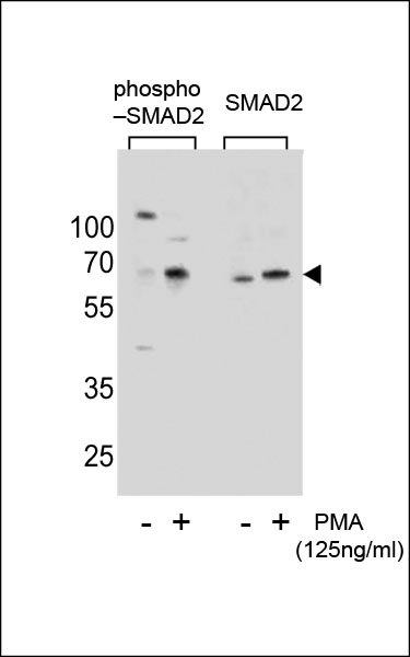 SMAD2 is a 58 kDa member of a family of proteins involved in cell proliferation, differentiation and development. The Smad family is divided into three subclasses: receptor-regulated Smad's, activin/TGF?receptor-regulated (Smad2 and 3) or BMP receptor regulated (Smad1, 5, and 8); the common partner, (Smad4) that functions via its interaction to the various Smad's; and the inhibitory Smad's, (Smad6 and Smad7). Smad2 consists of two highly conserved domains, the N terminal Mad homology (MH1) and the C-terminal Mad homology 2 (MH2) domains. The MH1 domain binds DNA and regulates nuclear import and transcription while the MH2 domain conserved among all the Smad's regulates Smad2 oligomerization and binding to cytoplasmic adaptors and transcription factors. Activated Smad2 associates with Smad4 and translocates as a complex into the nucleus, allowing its binding to DNA and transcription factors. This translocation of Smad2 (as well as Smad3) into the nucleus is a central event in TGF beta signaling. Phosphorylation of threonine 8 in the calmodulin binding region of the MH1 domain by extracellular signal regulated kinase 1(ERK 1) enhances Smad2 transcriptional activity, which is negatively regulated by calmodulin. The regulation of Smad2 phosphorylation on threonine 8 by ERK 1 and calmodulin is critical for Smad2 mediated signaling.