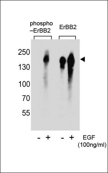 Western blot analysis of extracts from A431 cell,untreated or treated with EGF,using phospho-ERBB2-Y1005 (left) or ErBB2 antibody(right).