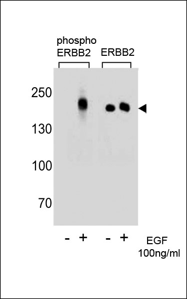 Western blot analysis of extracts from A431 cells,untreated or treated with EGF,100ng/ml,using phospho ERBB2 Y1196 (left) or ERBB2 antibody(right)