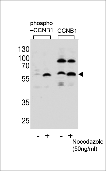 Western blot analysis of lysate from Hela cells(from left to right),untreated or treated with Nocodazole at 50ng/ml,using Phospho-CCNB1-S35 Antibody (Cat. APR05338G) or CCNB1-S9 Antibody.Lysate at 15ug per lane.APR05338G was diluted at 1:1100 dilution at each lane. A goat anti-rabbit IgG H&L (HRP) at 1:5000 dilution was used as the secondary antibody.