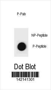 Dot blot analysis of CCNB1 Antibody (Phospho S35) Phospho-specific Pab (Cat. APR05338G) on nitrocellulose membrane. 50ng of Phospho-peptide or Non Phospho-peptide per dot were adsorbed. Antibody working concentrations are 0.6ug per ml. |