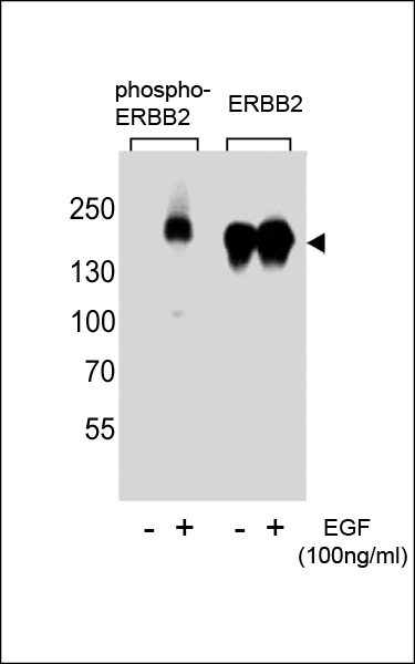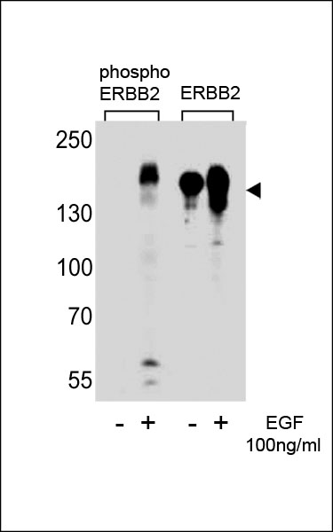 Western blot analysis of extracts from A431 cells,untreated or treated with EGF,100ng/ml , using phospho-ERBB2-Y1221(left) or ERBB2 antibody(right) |