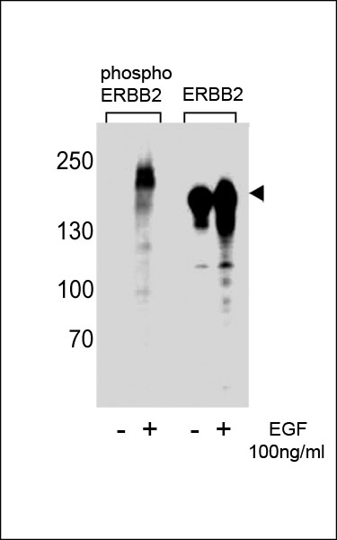 Western blot analysis of extracts from A431 cells,untreated or treated with EGF,100ng/ml,using phospho ErbB2-Y1222 (left) or ErbB2 antibody(right) |