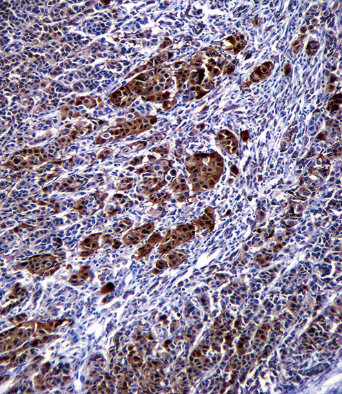 S100B Antibody (Cat. APR05455G)immunohistochemistry analysis in formalin fixed and paraffin embedded human malignant melanoma followed by peroxidase conjugation of the secondary antibody and DAB staining.This data demonstrates the use of S100B Antibody for immunohistochemistry. Clinical relevance has not been evaluated.