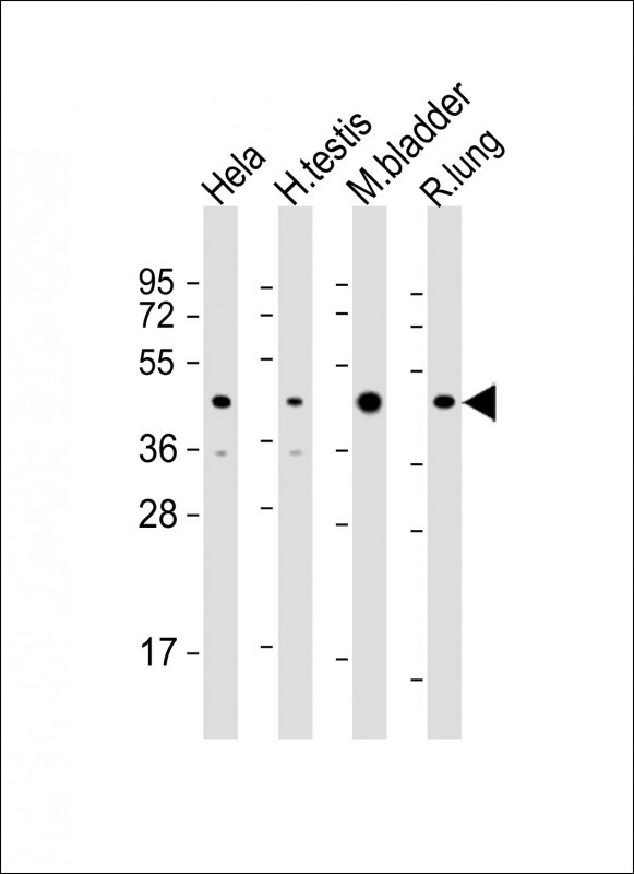 All lanes : Anti-WNT4 Antibody (Center) at 1:2000 dilution Lane 1: Hela whole cell lysate Lane 2: human testis lysate Lane 3: mouse bladder lysate Lane 4: rat lung lysate Lysates/proteins at 20 μg per lane. Secondary Goat Anti-Rabbit IgG, (H+L), Peroxidase conjugated at 1/10000 dilution. Predicted band size : 39 kDa Blocking/Dilution buffer: 5% NFDM/TBST.