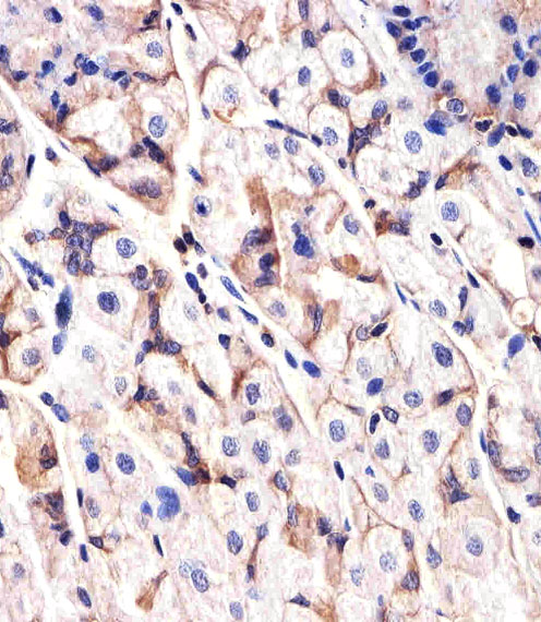 Immunohistochemical analysis of paraffin-embedded H. stomach section using EGFR Antibody (Y1092)( APR05963G). APR05963G was diluted at 1:25 dilution. A undiluted biotinylated goat polyvalent antibody was used as the secondary, followed by DAB staining.