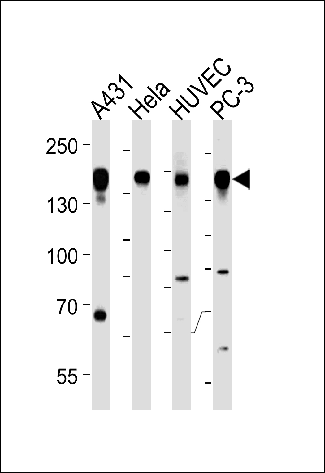 EGFR Antibody (pY1092) (Cat. APR05963G) western blot analysis in A431,Hela,HUVEC,PC-3 cell line lysates (35ug/lane).This demonstrates the EGFR antibody detected the EGFR protein (arrow). |