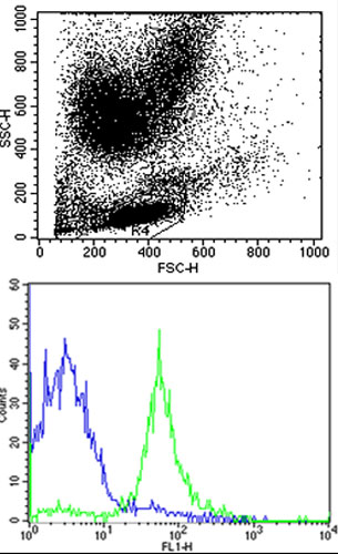 Flow cytometric analysis of human peripheral blood lymphocytes cells using HLA-B Antibody (N-term) (green, APR06103G) compared to an isotype control of rabbit IgG (blue). APR06103G was diluted at 1:25 dilution. An Alexa Fluor 488-conjugated goat anti-rabbit lgG at 1:400 dilution was used as the secondary antibody.