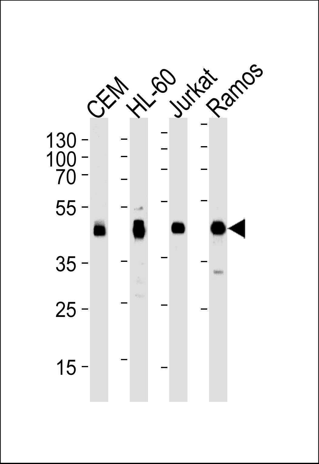 Western blot analysis of lysates from CEM, HL-60, Jurkat, Ramos cell line (from left to right), using HLA-B Antibody (N-term)(APR06103G). APR06103G was diluted at 1:1000 at each lane. A goat anti-rabbit IgG H&L(HRP) at 1:5000 dilution was used as the secondary antibody. Lysates at 35ug per lane. |