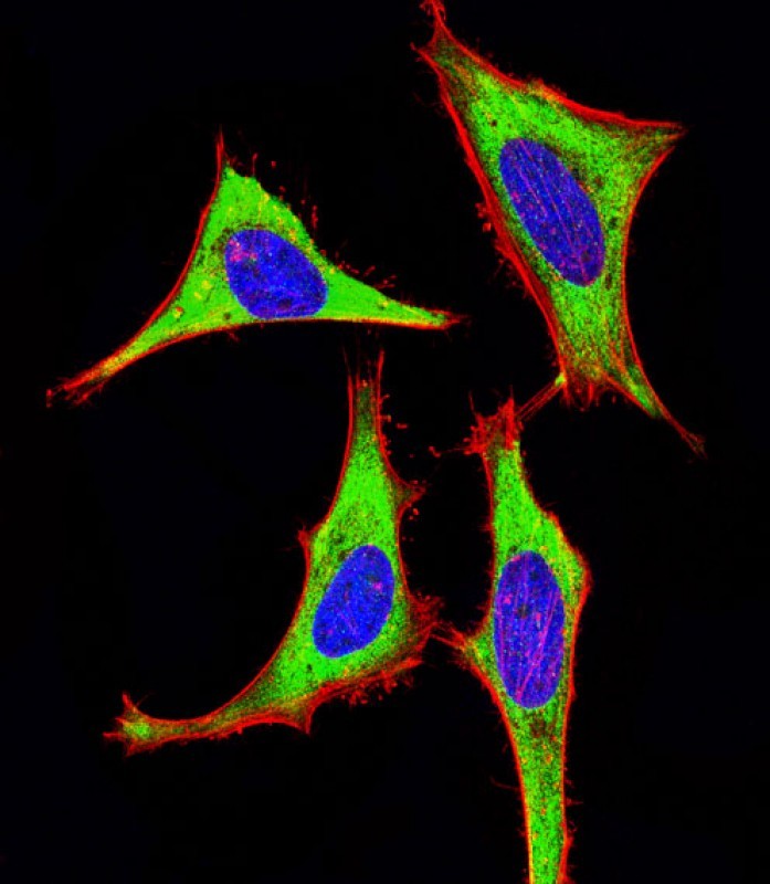 Immunofluorescent analysis of 4% paraformaldehyde-fixed, 0. 1% Triton X-100 permeabilized HeLa (human cervical epithelial adenocarcinoma cell line) cells labeling Pdx1 with APR06106G at 1/25 dilution, followed by Dylight? 488-conjugated goat anti-rabbit IgG (NK179883) secondary antibody at 1/200 dilution (green). Immunofluorescence image showing cytoplasm staining on HeLa cell line. Cytoplasmic actin is detected with Dylight? 554 Phalloidin (PD18466410) at 1/100 dilution (red). The nuclear counter stain is DAPI (blue).