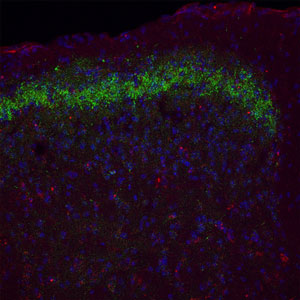 Prostatic Acid Phosphatase (PAP) - A Pain System Marker The tissue is adult mouse spinal cord. The green staining is PAP; the blue staining is DAPI (a nuclear stain). Secondary antibodies were from Jackson Immunoresearch.</p> |