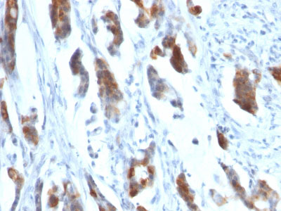 Formalin-fixed, paraffin-embedded human Gastric Carcinoma stained with MUC5AC Monoclonal Antibody (58M1). |