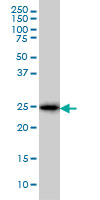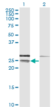 Western Blot analysis of CD99 expression in transfected 293T cell line by CD99 monoclonal antibody (M01), clone 3A10.Lane 1: CD99 transfected lysate(18.8 KDa).Lane 2: Non-transfected lysate. |