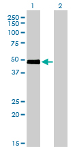 Western Blot analysis of CRLF1 expression in transfected 293T cell line by CRLF1 monoclonal antibody (M01), clone 4F4.Lane 1: CRLF1 transfected lysate(46.3 KDa).Lane 2: Non-transfected lysate. |