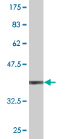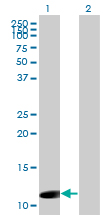 Western Blot analysis of ORF1-FL49 expression in transfected 293T cell line by ORF1-FL49 monoclonal antibody (M02), clone 4E11.Lane 1: ORF1-FL49 transfected lysate(10.6 KDa).Lane 2: Non-transfected lysate. |