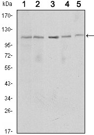 Figure 1: Western blot analysis using SIRT1 mouse mAb against MCF-7 (1), Jurkat (2), Hela (3), HEK293 (4) and A549 (5) cell lysate.