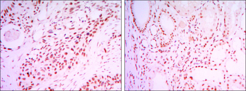 Figure 2: Immunohistochemical analysis of paraffin-embedded lung cancer tissues (left) and kidney cancer tissues (right) using SIRT1 mouse mAb with DAB staining.
