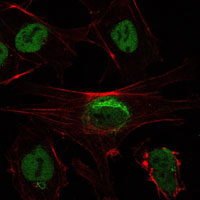 Figure 3: Immunofluorescence analysis of NTERA-2 cells using SIRT1 mouse mAb (green). Red: Actin filaments have been labeled with Alexa Fluor-555 phalloidin. |