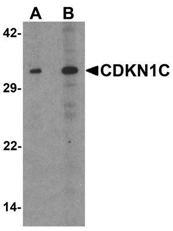 Western blot analysis of CDKN1C in 293 cell lysate with CDKN1C antibody at (A) 1 and (B) 2 ug/ml. |
